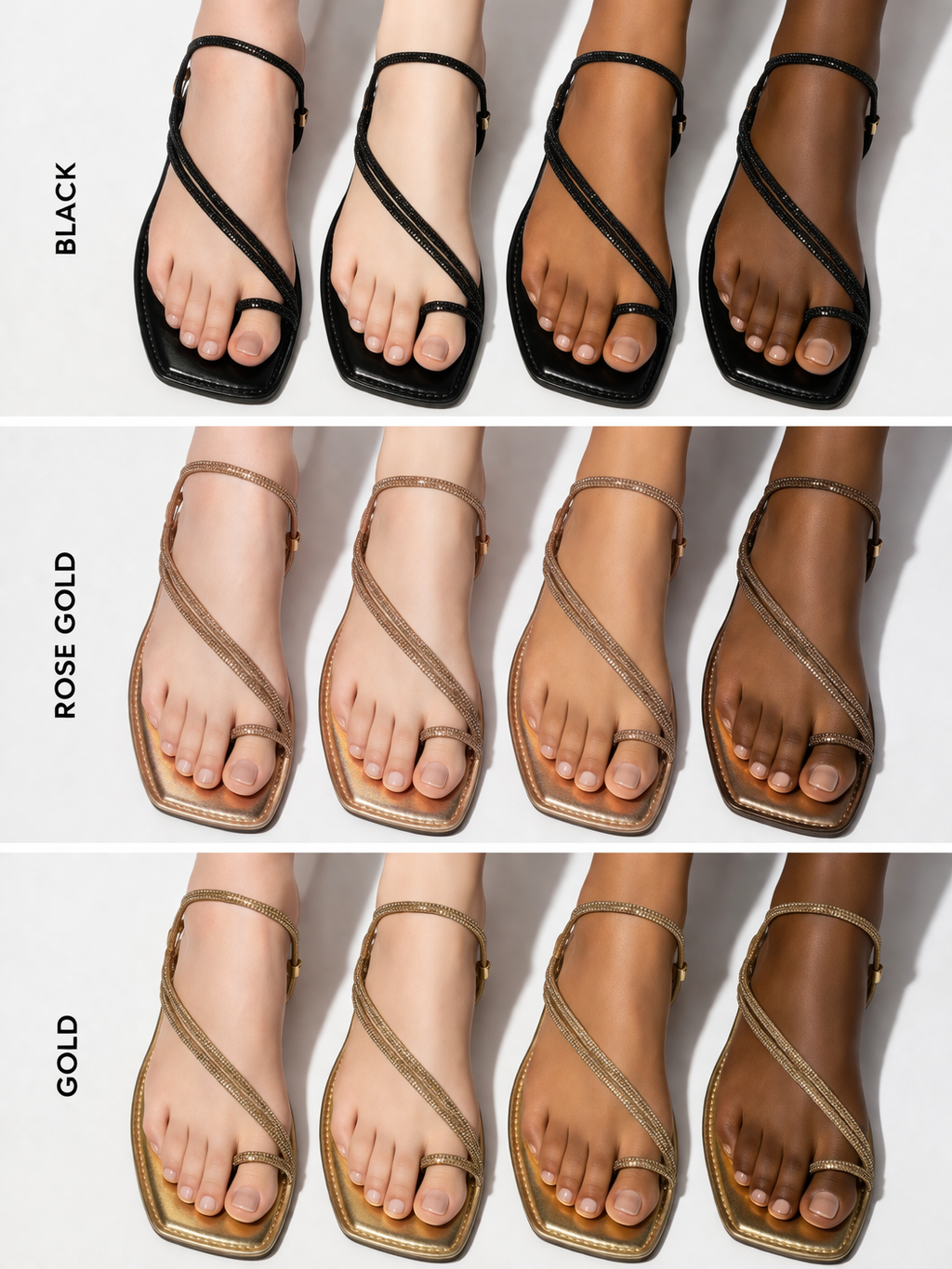 Elevate your look with our glitter-strapped flat sandals. Featuring a trendy square-toe design, they offer the perfect mix of comfort and glamour for any outfit.