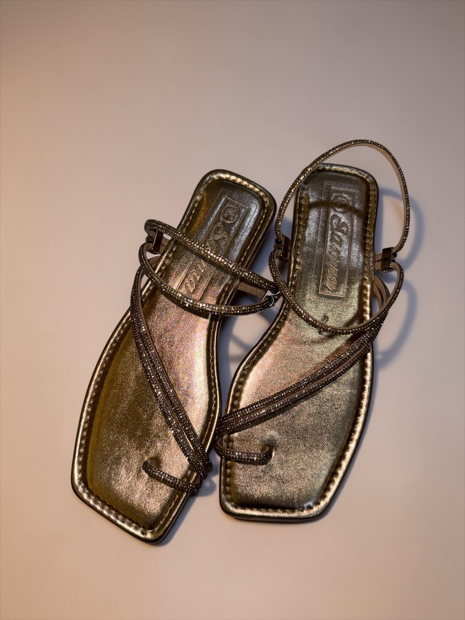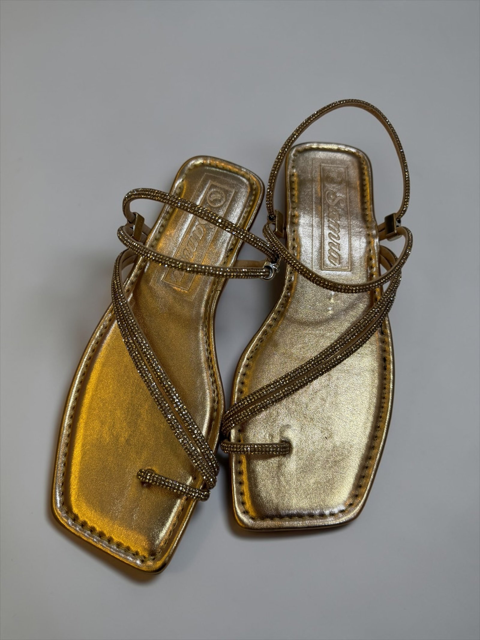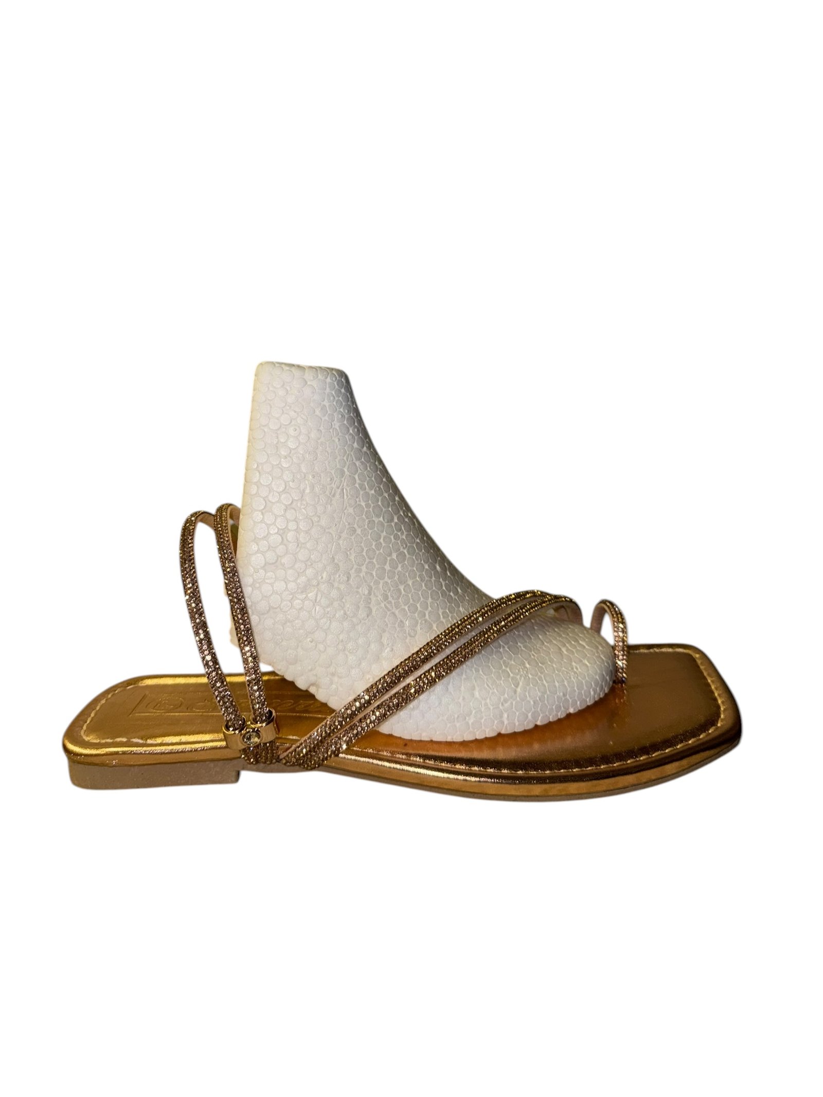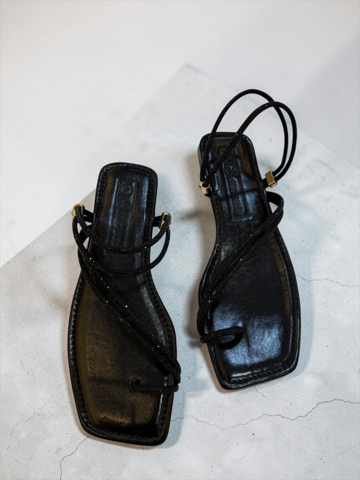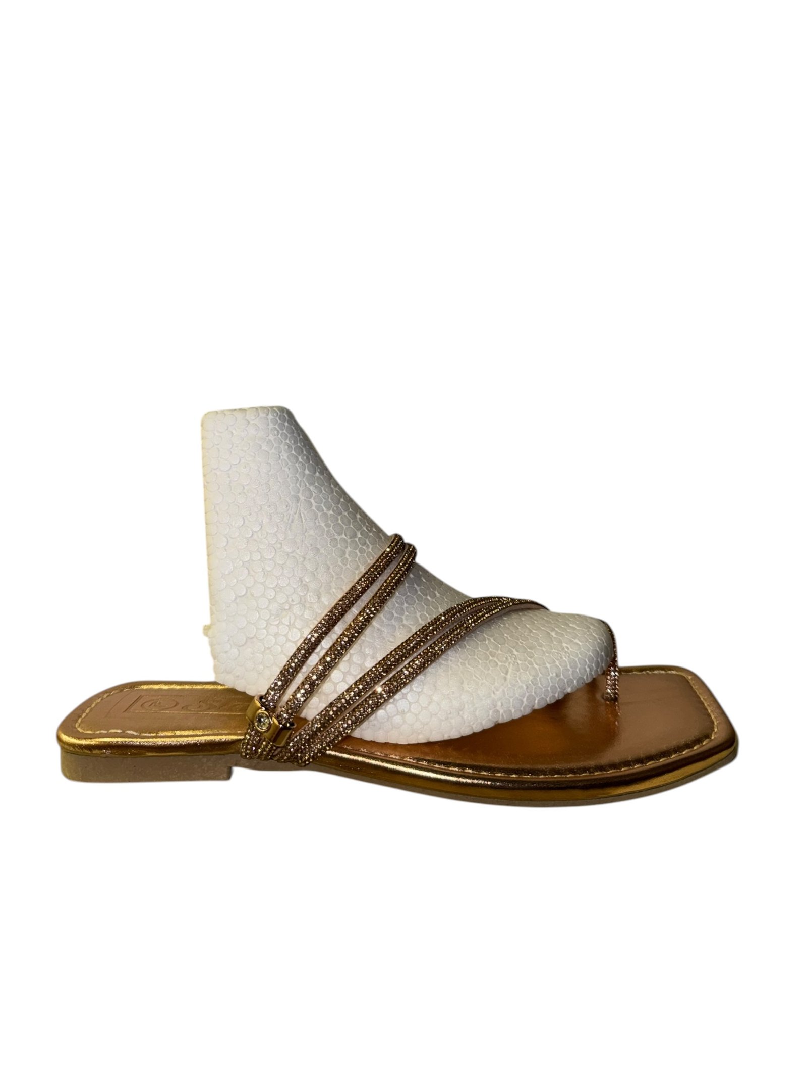 Elevate your look with our glitter-strapped flat sandals. Featuring a trendy square-toe design, they offer the perfect mix of comfort and glamour for any outfit.